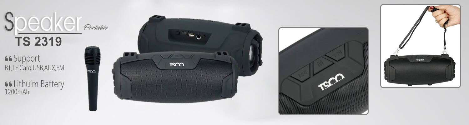 اسپیکر بلوتوثی TS 2319 برند تسکو از متریال مرغوب و مقاومی در ساخت بهره برده و صدای استریو بسیار رسا و باکیفیتی را با وجود ۲ درایو قدرتمند و توان کلی ۱۰ وات در محدوده فرکانسی ۱۰۰ هرتز تا ۱۸ کیلوهرتز با حساسیت سیگنال به نویز ۸۰ دسی بل به گوش می رساند. میکروفون داخلی نیز برای آن تعبیه شده تا امکان انجام مکالمه برای کاربر فراهم باشد. اسپیکر میکروفن دار تسکو TS2319 از اتصال بی سیم به گوشی موبایل، تبلت، لپ تاپ و سایر دستگاه های هوشمند از طریق بلوتوث پشتیبانی می کند که تا شعاع ۱۰ متری ارتباطی پایدار را برقرار نگه می دارد. روش های دیگری مانند رابط جک صوتی ۳٫۵ میلی متری (AUX) برای اتصال باسیم به دستگاه های فاقد بلوتوث، درگاه حافظه رم برای قراردادن کارت حافظه میکرو SD و پورت USB جهت اتصال فلش مموری نیز وجود دارد تا دسترسی های بیشتری برای پخش مستقیم آرشیو آهنگ ها و فایل های صوتی ذخیره شده برای کاربر امکانپذیر باشد.